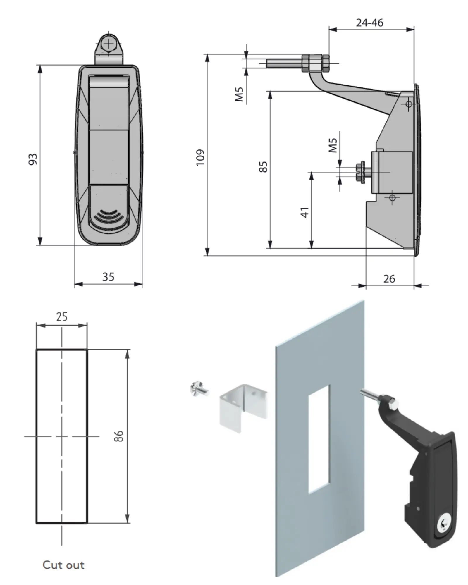 - Dociskowy zamek wykonany z lakierowanego na czarno znalu, o regulacji zakresu chwytania 24-46mm. Do drzwi o grubości maksymalnie 2mm, na jeden uchwyt mocujący.