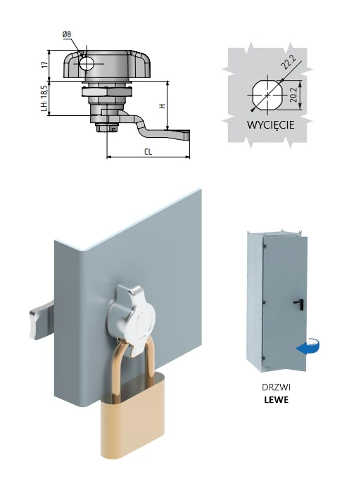 - Zamek przemysłowy z chromowanego znalu, z uchwytem blokowanym na kłódkę. Wersja na lewe drzwi.