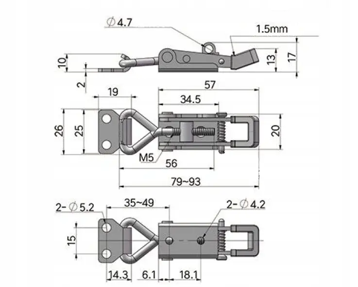 - Zatrzask kolankowy ze stali nierdzewnej, mocowany otworami, sprzedawany z uchwytem. Regulowany, o długości od 79mm do 93mm. Możliwość zabezpieczenia za pomocą kłódki.
