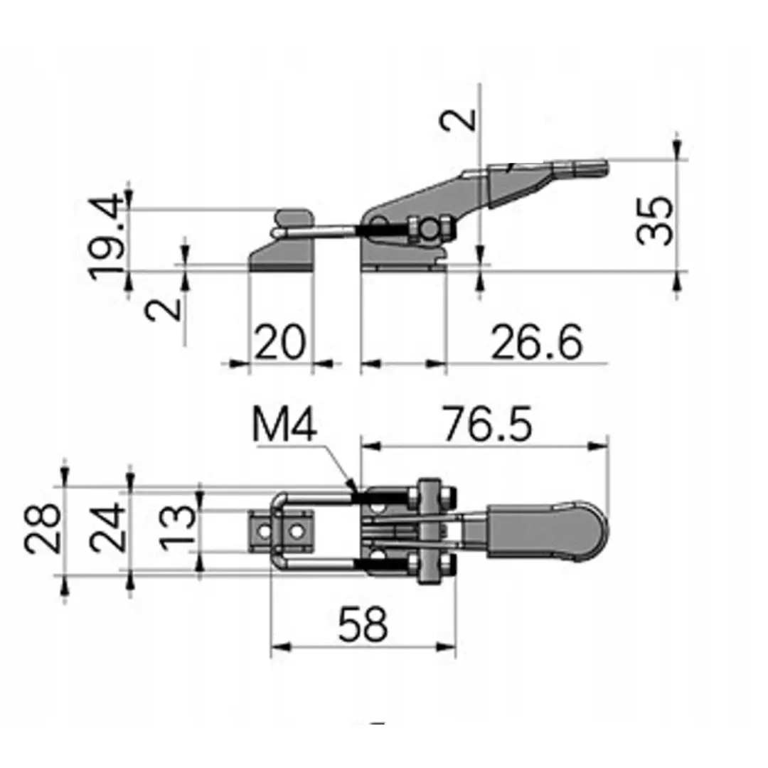 - Stalowy zatrzask kolankowy. Cynkowany, mocowany otworami, sprzedawany z uchwytem. Regulowany, o długości 58 mm dla części chwytającej i wysokości 35mm. Posiada wystający czerwony uchwyt wykonany z tworzywa PCV ułatwiający zamknięcie.