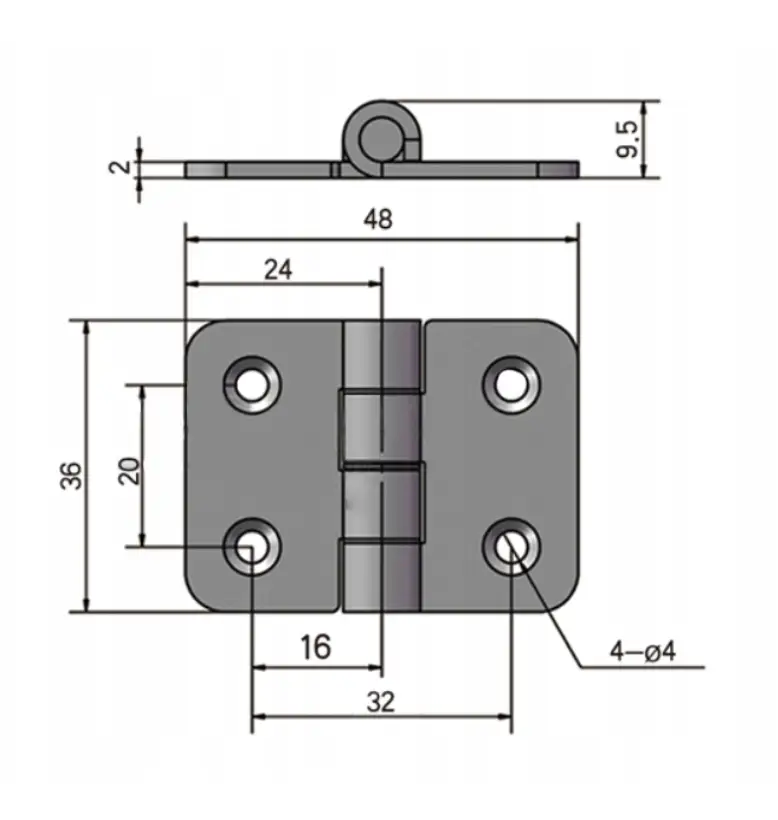 - Płaski zawias przemysłowy o wymiarach 36x48 mm. Wykonany ze stali nierdzewnej (AISI 304), mocowany za pomocą czterech otworów ⌀4 mm. Nadaje się zarówno do drzwi prawych jak i lewych.
