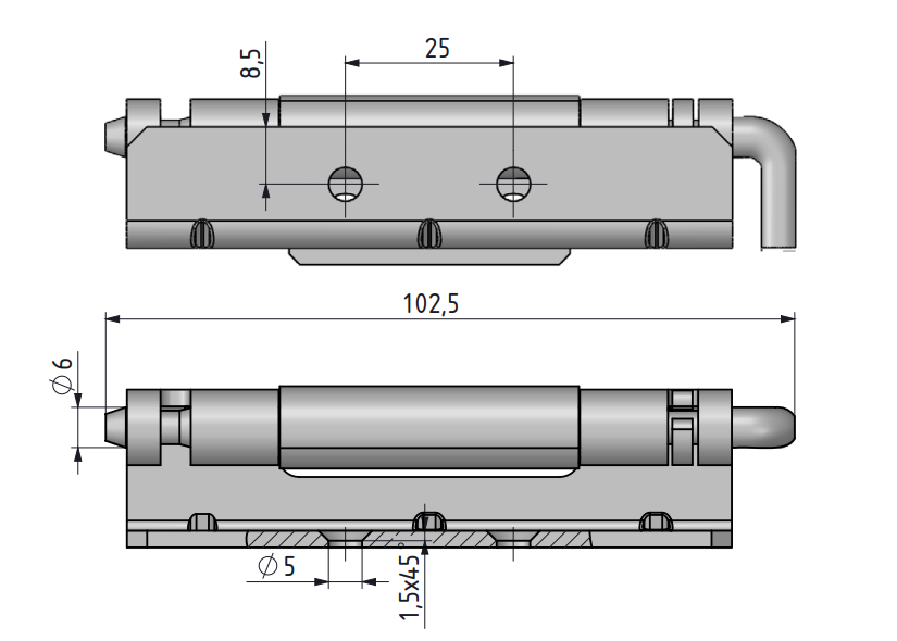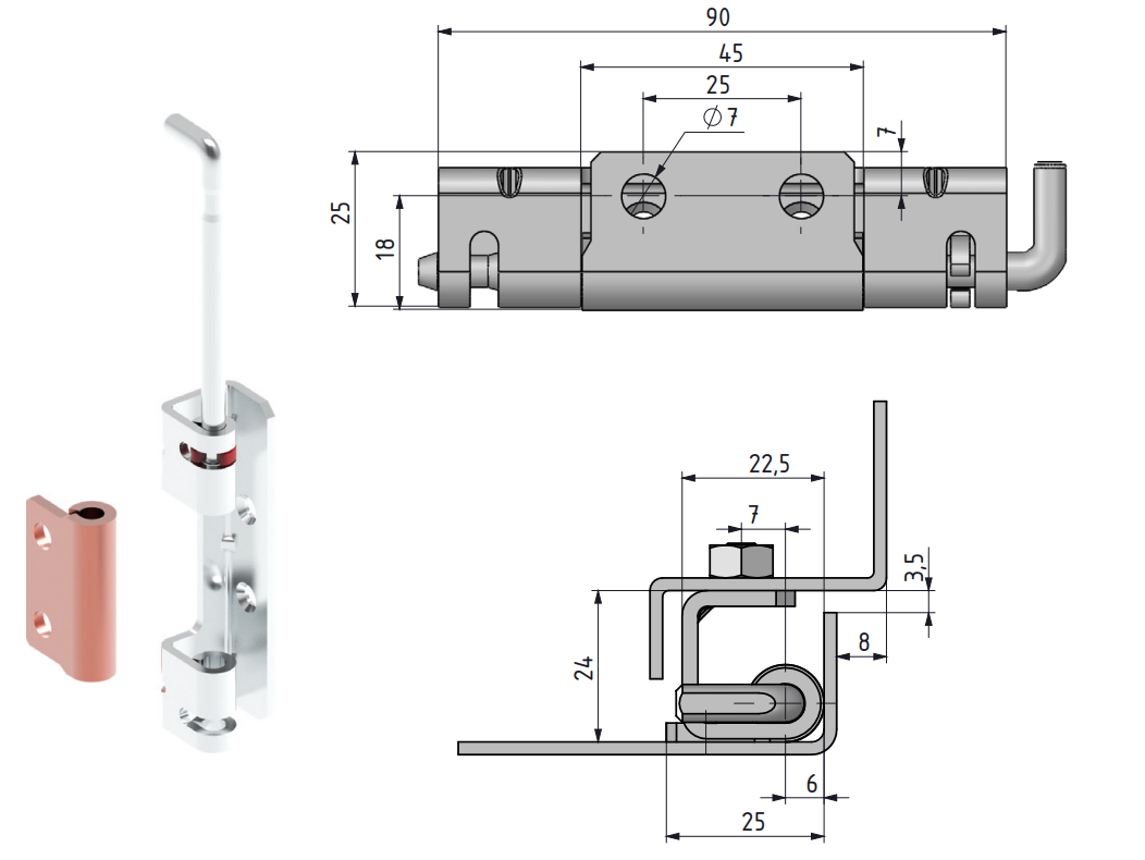 - Zawias 25x102,5x24mm, z ocynkowanej stali. Do drzwi o zagięciu 24mm, prawych oraz lewych. Korpus z dwoma otworami ⌀7mm, miedziowana część do przyspawania lub przykręcenia, z dwoma otworami ⌀7mm. Kąt rozwarcia to max. 110°.