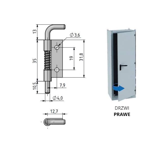 - Wewnętrzny zawias sprężynowy o wymiarach 19x60mm, ze sworzniem. Wykonany z ocynkowanej stali. Maksymalny kąt rozwarcia to 135°. Nadaje się do drzwi prawych.