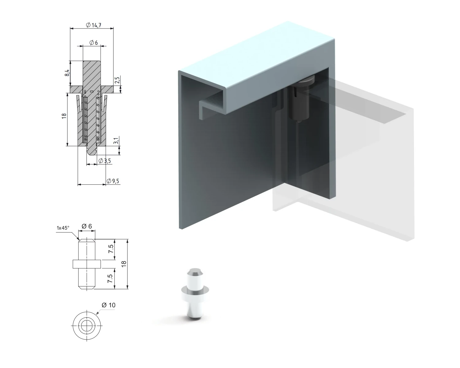 - Wewnętrzny zawias sprężynowy o wymiarach ⌀14,7x32mm. Wykonany z poliamidu, ze stalowym sworzniem. Maksymalny kąt rozwarcia to 110°. Nadaje się zarówno do drzwi prawych jak i lewych. Nadaje się do panelu o grubości 0,5-0,8mm.