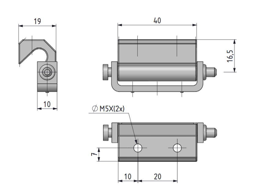 Zawias 19x60x31mm, z matowego aluminium. Do drzwi o zagięciu 25mm, prawych oraz lewych. Korpus mocowany dwiema śrubami M5x7mm, miedziowana część nieruchoma łatwa do przyspawania. Kąt rozwarcia to max. 110°, w zestawie ze śrubami.